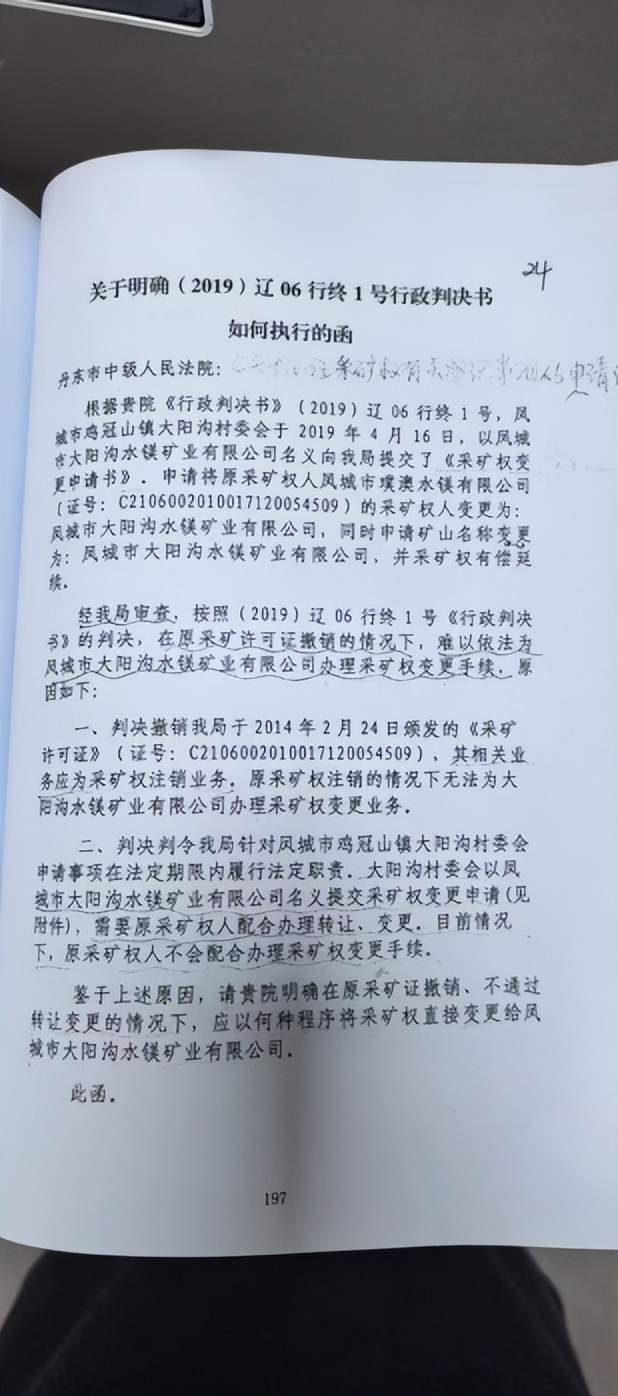 《关于明确(2019)辽06行终1号行政判决书如何执行的函》显示,丹东市自然资源局曾向丹东中院询问,“原采矿权注销、原采矿权人璞澳水镁公司不配合情况下,无法为大阳沟水镁矿业公司办理采矿权变更业务”,请求丹东中院明确如何将采矿权直接变更给大阳沟水镁矿业公司。