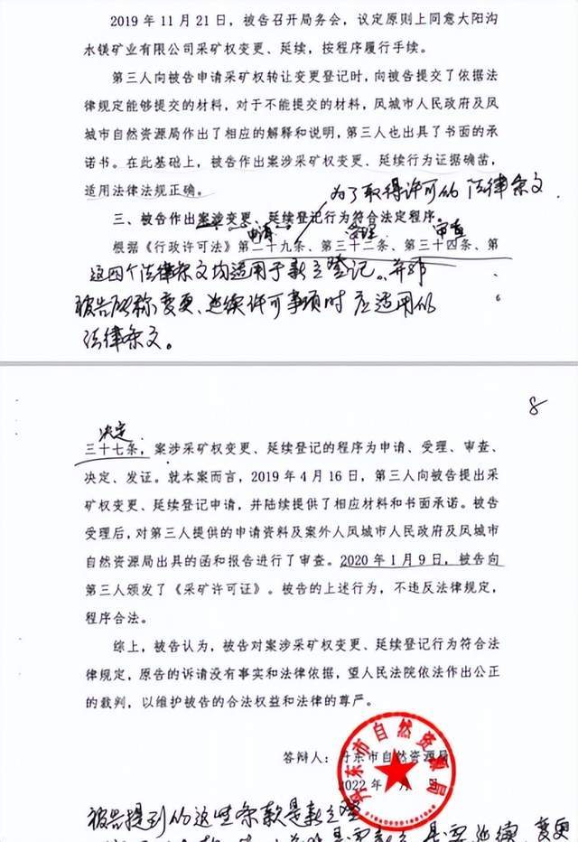 2022年,丹东市自然资源局在诉讼答辩中披露变更过程:大阳沟水镁矿业公司提出采矿权变更延续申请、大阳沟水镁矿业公司提供相应材料和承诺、凤城市政府及市自然资源局审查,2020年1月,丹东市自然资源局向大阳沟水镁矿业公司颁发《采矿许可证》,“不违反法律规定,程序合法”。