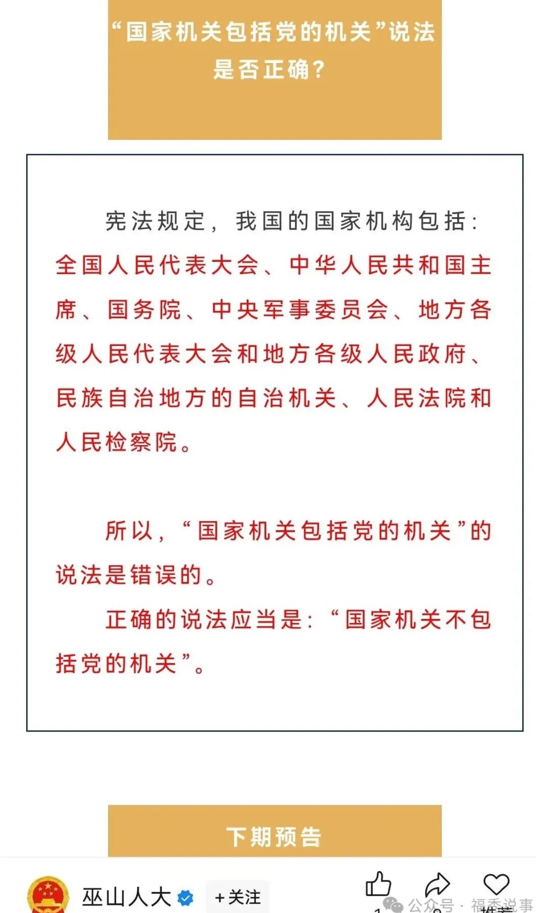 重庆市巫山县人大常委会官方微信公众号 “巫山人大”2025年8月7日的普法文章更明确指出:“‘国家机关包括党的机关’的说法是错误的,正确的说法应当是‘国家机关不包括党的机关’”,与一、二审判决认定直接相悖。