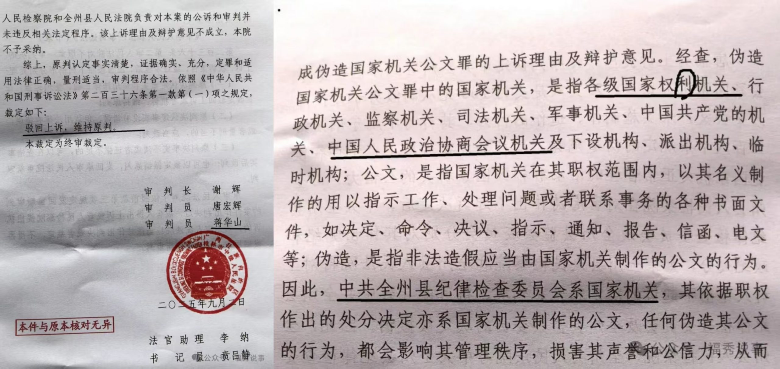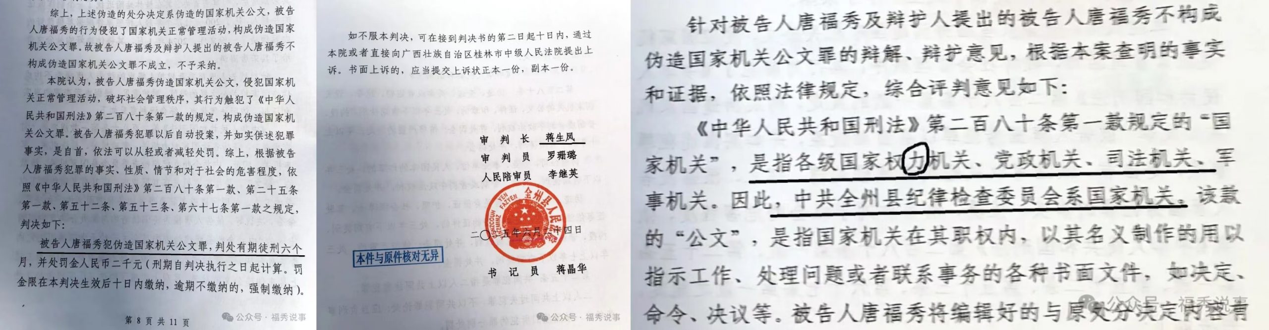 唐福秀自始至终不认为是犯罪,女儿袁婷对判决提出强烈质疑:“关键事实缺乏证据支撑,纪委的党内文件怎么能算国家机关公文?” 不服一审判决的唐福秀提起上诉,桂林市中级人民法院法官蒋华山主审此案。2025年9月2日,桂林中院作出(2025)桂03刑终270号刑事裁定书,裁定 “驳回上诉,维持原判”,这一结果让案件争议进一步发酵。